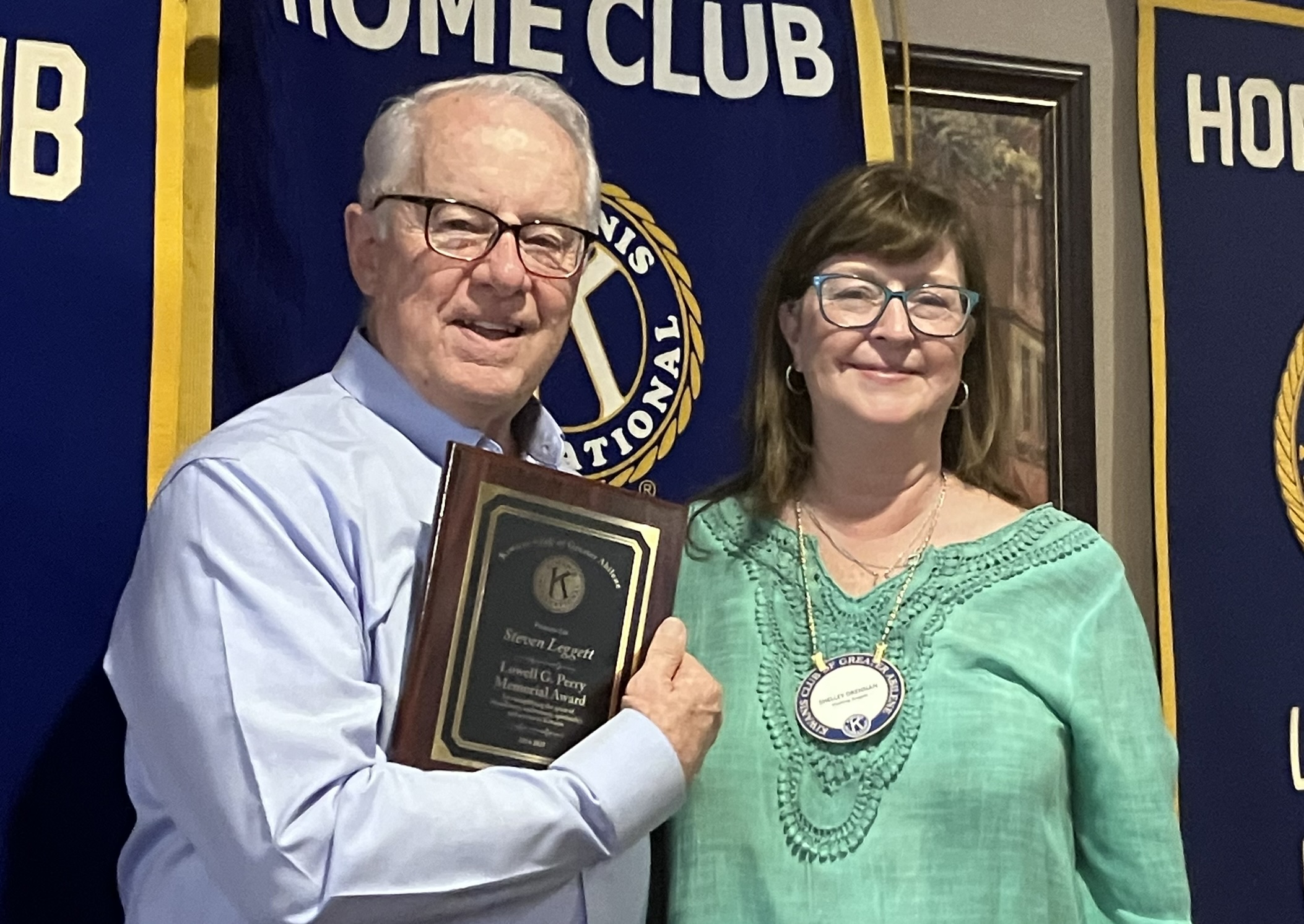 Greater Abilene Kiwanian Steven Leggett receives the Lowell Perry Award that exemplifies the spirit of friendliness and enthusiasm. Kiwanian Shelley Drennan received the award last year and presented the award to Steven.President Gail Jay receives a banner from Sam Nichols, President of Basketball Smiles. Greater Abilene Kiwanis helps support the basketball camp for kids. Sam had the kids sign the banner as a thank you for our support.President Gail Jay, Susan Holland, Nancy Baker and Melinda Blay bought 168 items for the Hendrick NICU. The items were donated by the club’s Young Children Priority One Committee.President Gail Jay presents a $1,000 check to Sam Nichols, CEO of Basketball Smiles. Basketball Smiles is a camp for the youth of the Bahamas that has been presented every summer for the last 26 years!!!Kiwanis Club of Greater Abilene sponsors the Hardin-Simmons University CKI Club. Club President Ross Stevens (left) and member Gavin Mouat (right) attended the CKI District Convention. Ross also received a $1,000 Scholarship from the Kiwanis Club of Greater Abilene.