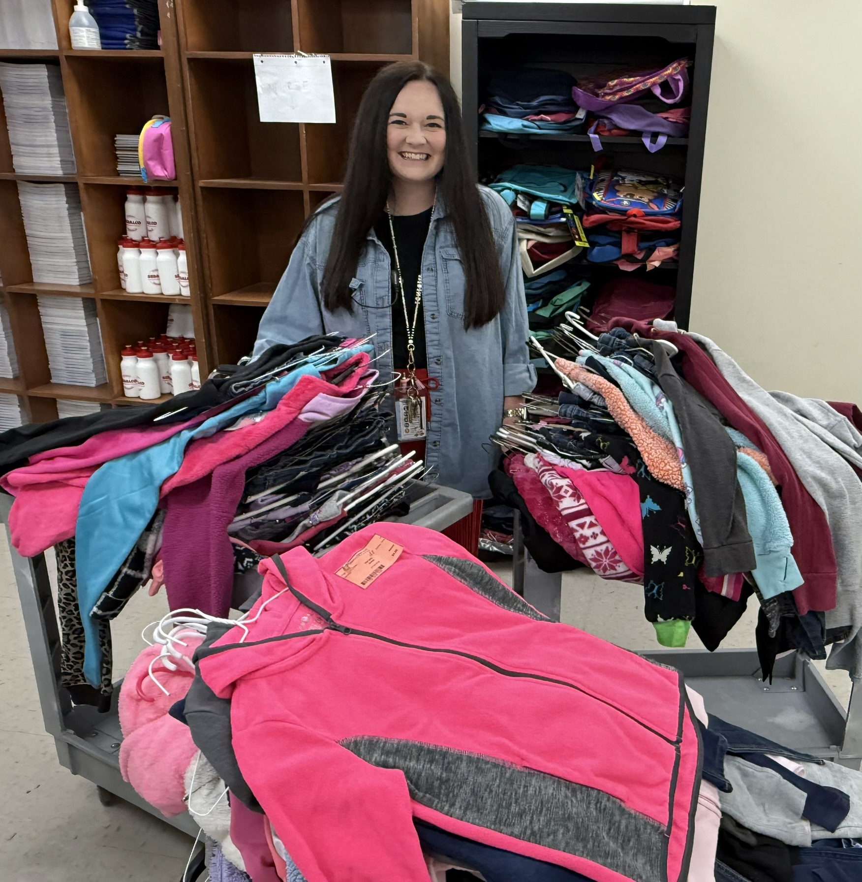 Stafford Elementary School Counselor Jaime Aleman checks out the coats that Greater Abilene supplied to the school.